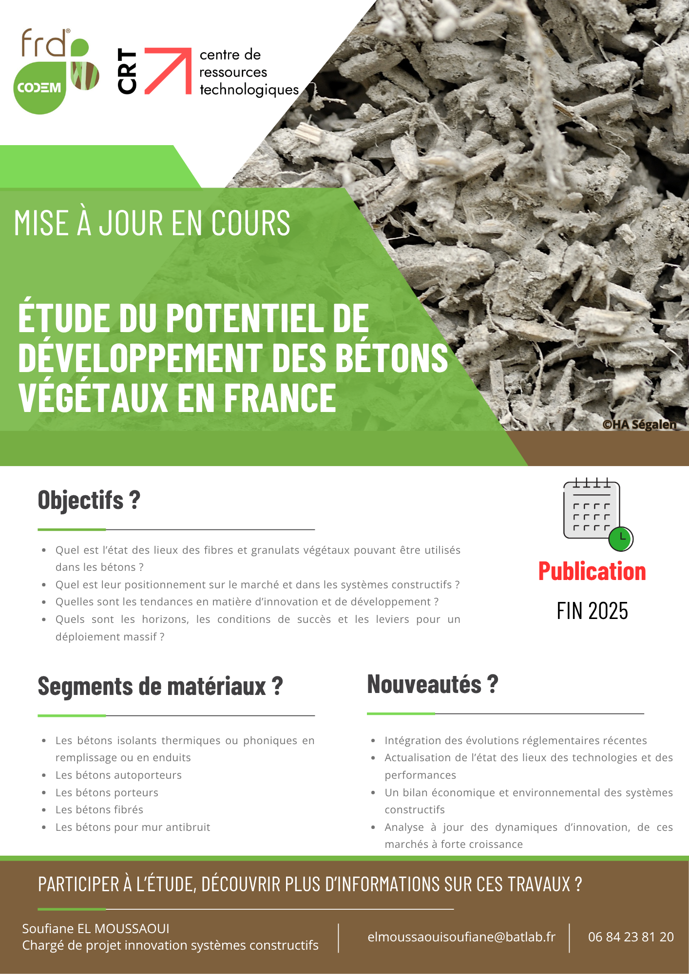 In view of developments in the plant-based concrete markets, FRD-CODEM is updating its 2019 study on the development potential of plant-based concrete in France to 2025. The objectives of the study are to answer the following questions: